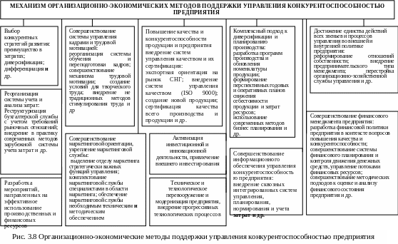 Как видно из рисунка 3.8, структуру основных элементов разработанного ОЭМ управления конкурентоспособностью формируют программно-целевые блоки, отражающие необходимые действия, конкретные организационные, экономические, технические и технологические мероприятия в их взаимозависимости, реализация которых способствует результативному осуществлению управленческих решений в данной сфере деятельности. Предлагаемый ОЭМ включает следующие блоки: выбор конкурентных стратегий развития; реформирование системы управления персоналом и трудовой мотивацией; повышение качества и конкурентоспособности продукции и предприятия внедрение систем управления качеством и их сертификация; системный подход к диверсификации и планированию производства; достижение единства действий всех звеньев и процессов управления во внешней и внутренней политике предприятия; реорганизация системы учета и анализа; совершенствование маркетинговой ориентации, укрепление маркетинговой службы; активизация инвестиционной и инновационной деятельности, привлечение внешнего инвестирования; совершенствование информационного обеспечения управления конкурентоспособностью; совершенствование финансового менеджмента; разработка мероприятий, направленных на эффективное использование производственных и финансовых ресурсов; техническое и технологическое перевооружение и модернизация предприятия, внедрение прогрессивных технологических процессов.