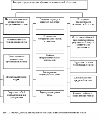 Экономическая свобода предприятия в современных рыночных условиях характеризуется, как правило, повышенным хозяйственным риском, определяемым нестабильностью спроса, цен, поведения конкурентов, влиянием случайных факторов неэкономической природы на эффективность принятия управленческих решений, изменчивостью рыночной конъюнктуры и т.д. В отечественной экономической литературе достаточно хорошо разработаны основные факторы, вызывающие нестабильность экономики России. Учитывая высокую степень интеграции мировой экономики, считаем необходимым, включить дополнительно к этим факторам фактор влияния процессов глобального, макро и микро уровней (см. рис. 1.1).