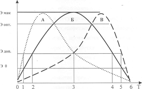 Центральная конфигурация Б отражает наиболее конструктивную модель развития организации, что непосредственно следует из анализа эпюр допустимой и оптимальной эффективности, рассчитываемых в проекциях точек 1 – 6. Эти конфигурации траектории развития полиграфической организации являются основой разработки, выбора и реализации стратегии и тактики организационных изменений в условиях той или иной модели развития. Они позволяют соотнести и увязать направления, тенденции и темпы организационных изменений с характеристиками жизненного цикла полиграфической организации.