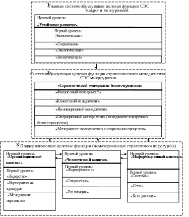 Функционально-системный подход реализован в функционально-системной модели следующим образом. Результаты достижения целей первого уровня Ф1у «Экономическая», Ф2у «Социальная», Ф3у «Экологическая», Ф4у «Политическая» социально-экономической системы макро- и мезо уровня (страна, регион, город, группа видов экономической деятельности (отрасль)), опосредованно через институциональную среду, влияют на постановку целей и реализацию задач системообразующей целевой функции Ф0б «Стратегический менеджмент бизнес-процессов» социально-экономических систем микроуровня.