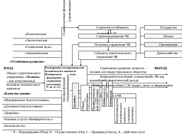 Автором приведена общая процессная модель стратегического управления человеческим капиталом (ЧК) в социально-экономических системах, разработанная в рамках функционально-системного подхода. Процессная модель (рис. 1) отражает системные взаимосвязи и взаимообусловленность целевых функций управления: системообразующей управляющей функции Ф