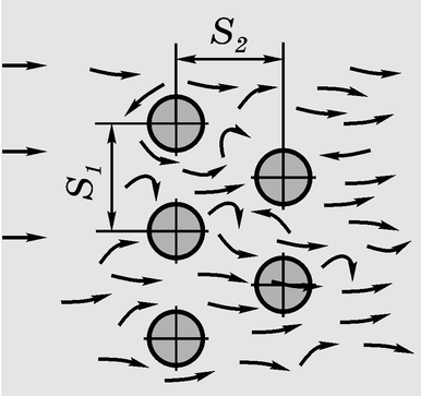 В трубчатом теплообменнике (Рис.1), изготовленном из труб с внешним диаметром d = 42 мм, расположенных с шагами S1 = 85 мм и S2 = 65 мм, движется поток смеси газов, имеющий среднюю температуру tг = 893 0С. Тепло от газа к наружным стенкам труб, температура которых равна tст = 487 0С передается за счет излучения углекислоты CO2 и водяных паров H2O (их парциальные давления соответственно равны PCO2 = 0,110 бар, PH2O= 0,100 бар, степень черноты стенок труб ст = 0,82).