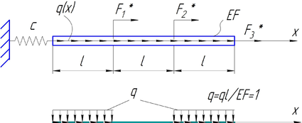 Требуется исследовать решение задачи о продольной деформации прямолинейного стержня, закрепленного на пружине, с приложенными по его длине распределенными нагрузками и сосредоточенными силами.
