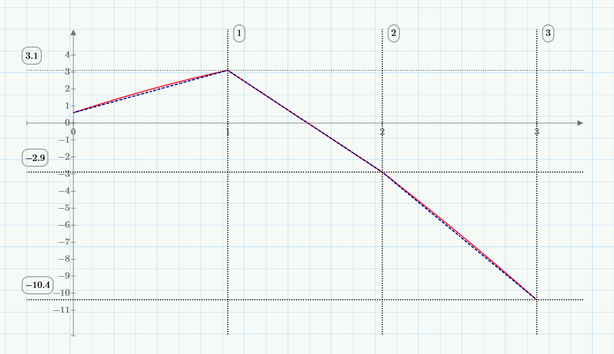 На рисунке 5 представлены точное решение для относительных перемещения сечений стержня (красная сплошная линия) и линейно аппроксимированные относительные перемещения, определённые энергетическим методом (синяя пунктирная линия).