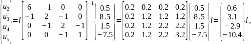 Полученная система уравнений распадается на две части, решаемые последовательно. Вначале решим последние четыре уравнения относительно неизвестных узловых перемещений