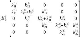 Тогда глобальная матрица жёсткости для системы, состоящей из четырёх конечных элементов, имеет вид