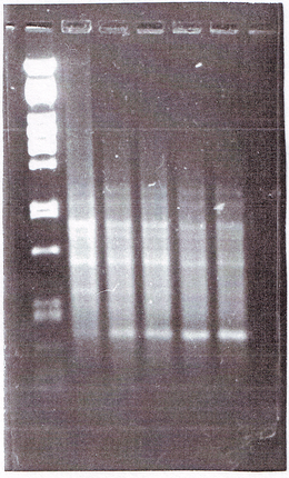 В качестве контроля ставили пробу без ДНК и пробу без праймера. Продук-ты реакции (около 10 мкл из реакционной смеси) разделяли электрофорезом в 2% агарозном геле в трис-боратном буфере и фотографировали на пленку “Микрат” в проходящем УФ-свете после окрашивания бромистым этидием.