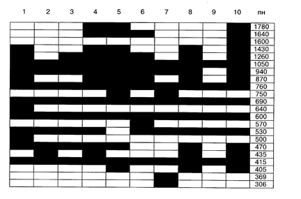 На рисунке 3 показано присутствие амплифицированных фрагментов ДНК с указанием их размеров, а в таблице 1 – матрица состояний бинарного признака наличия/отсутствия (1/0) полос с одинаковой электрофоретической подвижнос-тью в RAPD – спектрах изученных растений. Минорные полосы слабо выявля-ющиеся на электрофореграммах рассматривались как отсутствующие, и им приписывалось значение 0.