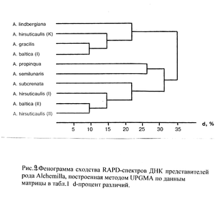 По этим данным рассчитана матрица различий между видами и популяциями манжетки,по которой построена фенограмма (рис.4).Полученные данные свиде-тельствуют,что как апогамные A.vulgaris L.Ampliss.,так и популяции одного ви-да различаются по RAPD-спектрам, при этом диапазоны уровней сходства меж-ду популяциями и видами могут перекрываться.