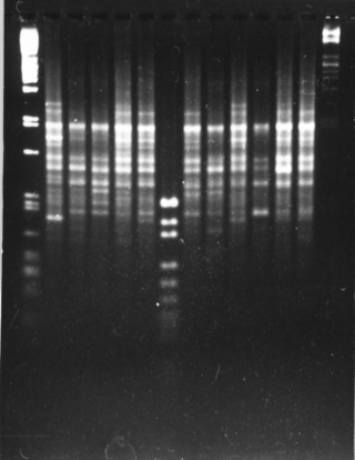 Реакционная смесь объёмом 20 мкл содержала 1 ед. Taq полимеразы “Prome-ga”, в буферном растворе, предлагаемом фирмой, по 100 мкМ dATP, dTTP, dCTP, dGTP, 1мкМ праймера, 4 mM MgCl2 и 10-20 нг ДНК. ДНК амплифици-ровали в течение 36 циклов в програмируемом термостате “Циклотемп” (СТМ, Москва) в режиме: денатурация – 1 мин 94ºС, отжиг – 1 мин 37ºС, элонгация – 2 мин 72ºС. Продукты реакции (около 10 мкл из реакционной смеси) разделяли электрофорезом в 2%-ном агарозном геле в трис-боратном буфере и фотогра-фировали на плёнку “Микрат” в проходящем УФ-свете (305 нм) после окра-шивания бромистым этидием.