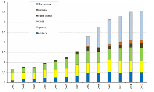 Таблица 1-3. Количество гиперссылок по адресантам в одном сообщении агентства Lenta.ru (2000 – 2012 гг.)