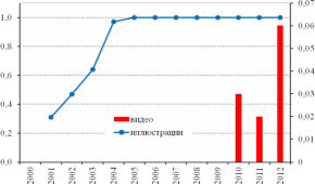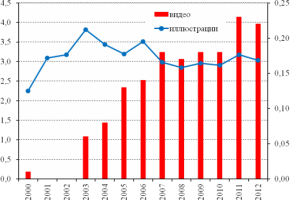 Рисунок 1-10. Динамика использования иллюстраций и ссылок на видео в новостных материалах агентства NEWSru.com (2000 – 2012 гг.)