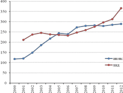 Написание нового текста можно было бы объяснить стремлением сэкономить место на странице (чем она компактнее, тем удобнее потребителю просматривать оглавление и анонсы). Однако сравнение средних величин объемов лида и анонса за годы работы агентства NEWSru.com показывает, что разница между ними не настолько значительна, чтобы составление анонса было оправдано экономией места на странице (рисунок 2-5).