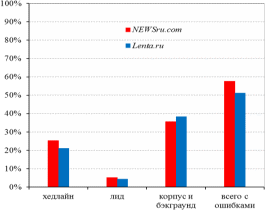 В таблице 2-2 и на рисунке 2-7 приведены данные о наличии стилистических ошибок в хедлайне, лиде и корпусе новостных сообщений изучаемых агентств. Учитывались только ошибки микроуровня: как было сказано выше, для рерайтерских материалов "стилевой разнобой" и "неудачно выбранный стиль" ошибками считать не следует.