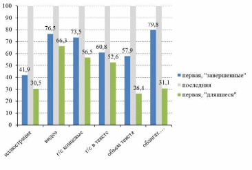 76,7% единичных новостных сообщений Lenta.ru уже в первой публикации содержат все необходимые элементы, тогда как для цепных этот показатель – всего лишь 22,3%. Таким образом, первые вполне ожидаемо появляются на сайте в более "укомплектованном" виде. Цепные сообщения готовятся рерайтером, как правило, в более сжатые сроки и пополняются контентом (включая обязательные