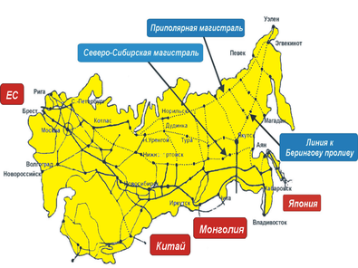 Таких широтных коридора может быть сформировано три. Приполярный транспортный коридор опирается на Приполярную железнодорожную магистраль Салехард – Уэлен с выходом через туннель под Беринговым проливом на железнодорожную сеть стран NAFTA, северный транспортный коридор базируется на Севсибе, южный транспортный коридор – на Транссибе. Строительство Севсиба и усиление Транссиба предусмотрены Стратегией–2030, Приполярная магистраль – нет. Этим, в частности, Стратегия–2030 отличается от социально-ориентированной стратегии, в которой Приполярная магистраль мыслится и как транзитная и как опорная железная дорога для освоения запасов нефти и газа на российском шельфе Северного Ледовитого океана.