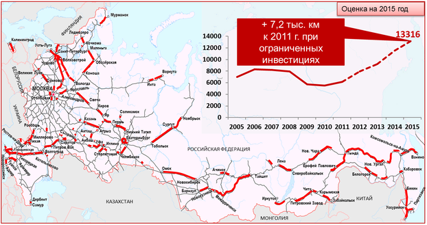 В целом изменения грузопотоков привели к повышению загрузки и практически полному использованию пропускной способности на основных направлениях сети, прежде всего, это подходы к портам, Транссиб, БАМ, полигоны от Кузбасса в Центральный и Южный регионы, а также через Урал на северо-запад (рисунок 3.6). ОАО «РЖД» целенаправленно осуществляет развитие и модернизацию железнодорожной инфраструктуры, но, несмотря на принимаемые меры, потенциал инфраструктуры ограничен в условиях наличия на сети более 6 тыс. км узких мест, протяженность которых при отсутствии дополнительных инвестиций к 2015 г. может достичь 7,2 тыс. км (рисунок 3.7).