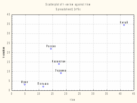 Из графика следует, что Россия существенно активнее использует наличную железнодорожную сеть, чем ближайшие партнеры по СНГ – Казахстан и Украина. Следовательно, для России более актуальна задача расширения железнодорожной сети, чем для этих стран. Вместе с тем можно отметить, что по темпам железнодорожного строительства Казахстан существенно опережает современную Россию.