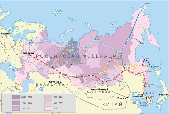Транскорейская железнодорожная магистраль от Южной Кореи до Западной Европы длиной 14 тыс. км, как утверждают специалисты, способна вдвое ускорить сроки доставки товаров по сравнению с Трансокеанским южным путем и наполовину снизить стоимость транспортировки. До 600 тысяч большегрузных контейнеров, отправляемых с Корейского полуострова, позволят довести годовой объем грузоперевозок по Транссибу до 150 млн т в год и принести России до 2,5 млрд дол. дохода. В результате осуществления проекта воссоединения железнодорожных систем Республики Корея и КНДР с Транссибом будет создан железный шелковый путь, который начнется в Республике Корея и протянется через территории КНДР и России в страны Европы. Единая железнодорожная система не только свяжет обе Кореи, но и будет иметь выход на Японию, Китай и другие страны ЮВА[146].