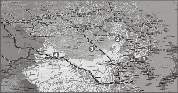 • после реализации проекта соединения железных дорог двух корейских государств имеется четыре варианта выхода Транскорейской магистрали на Транссиб (рисунок 3.15). Только один из них (вариант 1 – через ст. Хасан) ведет на Транссиб в обход Китая. Два других варианта тоже представляют собой выход на Транссиб, но значительно западнее – через Читу (вариант 2) и Наушки с транзитом через Китай и Монголию (вариант 3). Вариант 4 представляет собой выход на Транссиб через СУАР и Казахстан в районе Омска, его южное ответвление идет по маршруту Великого шелкового пути. В железнодорожном исполнении данный вариант называется ТРАСЕКА (маршрут Средняя Азия – Кавказ – Европа).