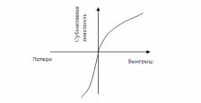 будет зависеть от исходной точки (предыдущее состояние, относительно которого оценивается ситуация), то есть люди по-разному будут реагировать на одинаковые ситуации в зависимости от того теряют они что-то или выигрывают. Особенность теории перспектив заключается в том, что точка отсчета является очень важным моментом, когда потребители оценивают возможные результаты. На этом основании сделаны следующие выводы, что, во-первых, что человек не способен оценить будущие доходы в абсолютном выражении, оценивает их в сравнении с обычным уровнем доходов или с уровнем, который сложился; во-вторых, при одинаковом риске люди больше склонные к сохранению достигнутого финансового уровня, чем к его увеличению. На основе экспериментальных данных Д. Канеман и А. Тверски вывели функцию ценности, которая определялась в значениях отклонения от исходной величины. Кривая является выпуклой вверх для выигрышей и вогнутой вниз для потерь, что означает склонность к избеганию риска при выигрышах и склонность к риску при проигрышах, причѐм при проигрышах функция ценности имеет более крутой наклон, чем при выигрышах (рис.3-4)