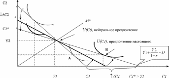 В текущем периоде прирост потребления (переход из точки А в точку В) обеспечивается за счет кредитных ресурсов С1 = С1* - С1 = -S, при этом образуется долг D. Следовательно, во втором периоде потребление сократится на аналогичную величину (кредит Сr плюс d процентные платежи) С2 = С2 - С2* = D. Таким образом, если потребитель занимает средства, он потребляет часть своего будущего дохода. Домохозяйство является чистым заемщиком, если величина текущего потребления систематически превышает текущий доход. Это означает, что в течение жизненного цикла домохозяйство может, как брать заемные ресурсы, так и давать в долг накопленные сбережения, но в итоге остается должником своим кредиторам (D>S). Поведение потребителя, выбирающего предпочтение настоящего, в теории называют «эффектом близорукости», когда экономический агент не способен полностью оценить все последствия принятого решения.