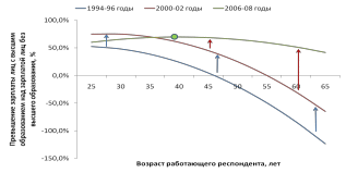 Рост популярности высшего образования привел к существенному увеличению удельного веса работников с высшим образованием в общей численности занятых. Одна из причин - инвестиции в собственное образование или образование детей, гипотетически связано с ростом будущих доходов, отдача от вложений в профессиональное образование постоянно растет (рис.6-8).