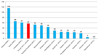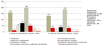 Как показывают данные (рис.6-14) домохозяйства наращивают информационное имущество: самый высокий показатель наличие телефона мобильной связи, причем независимо от места проживания, уровень обеспечения радио- и телевизионными устройствами также превышает 100% охват. Обеспеченность российского населения персональными компьютерами составляет в целом 57 ПК на 100 домохозяйств, что выше среднемирового показателя - 34, но существенно ниже экономически развитых стран (рис. 6-15).