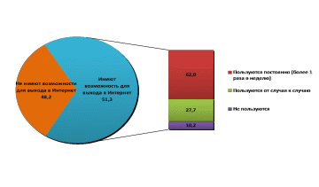 Рис. 6-16. Наличие возможности и частота выхода в Интернет (в %)