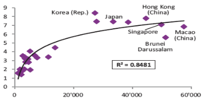 Уровень подушевого национального дохода имеет очень сильную положительную корреляцию с уровнем ИО, измеряемым индексом IDI, а в исследованиях EIU 2004 г. выявлена очень тесная корреляция между ИКТ и экономическим ростом. Этот вывод основан на данных регрессионного анализа, в ходе которого определялось значение коэффициента множественной корреляции (R-квадрата, R2)77. При этом, чем выше показатели IDI и уровня ВВП на душу населения, тем сильнее эта зависимость. В кластере развитых восточноазиатских стран - один из самых высоких региональных показателей (уступающий только региональному показателю группы арабских государств с высокими доходами) корреляции между индексом IDI и уровнем валового национального дохода на душу населения: R2 = 0,8481 (Рисунок 3.9.1). Столь высокий показатель означает очень сильное воздействие ИКТ на экономический рост и повышение подушевых доходов.