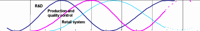 Концепция и практика коэволюции производственных, торговых и инновационных систем двух стран насчитывают более тридцати лет, с начала 1970-х гг., когда японское Министерство международной торговли и промышленности (Ministry of International Trade and Industry, MITI) постулировало концепцию и проводило кампанию промышленной экологии. Аналогичная кампания проводилась в США Национальной инженерной академией (National Academy of Engineering), а Советом по конкурентоспособности США (US Council on Competitiveness) начала разрабатываться концепция экосистемы. В качестве основного принципа промышленной экологии был объявлен принцип замещения имеющихся производственных факторов в пользу экологически бережливых и способствующих устойчивому развитию. Эти параллельно проводившиеся в двух странах кампании положили начало циклам «взаимно вдохновляющего» коэволюционного развития (mutually inspiring co-evolutionary development cycle). Считается, что циклы «взаимно вдохновляющего» коэволюционного развития (mutually inspiring co-evolutionary development cycle) в области научных исследований (R&D, с 1950-х гг.), производства и контроля качества (Production and quality control, с 1960-х гг.) и розничной торговли (Retail system, после 1965 г.) способствует построению экономики, ориентированной на услуги в процессе перехода от индустриального к информационному и от информационного к вездесущему обществу (Рисунок 4.1.1).