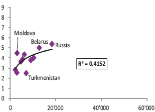 Уровень ИО высоко коррелирует с уровнем благосостояния страны. Степень этой корреляции выражает квадрат коэффициента множественной корреляции R2 между уровнем ИО (измеренным индексом IDI) и подушевым доходом (в показателях валового национального дохода на душу населения, ВНД на д/н, по паритету покупательной способности, ППП). Коэффициент множественной корреляции R2 составил в 2010 г. в регионе СНГ лишь 0,4152 (Рисунок 6.5.1).