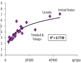 Рисунок 6.5.1 - Корреляция между уровнем ИО (IDI) и уровнем подушевого дохода в регионах СНГ и Америки