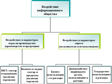 | (производители и производство) Ф Производители товаров и услуг ИКТ Отрасль промышленности, размер, другие характеристики Тип, доходы от ИКТ, производимые ИКТ товары и услуги Р Н | И которых зависит развитие ИО П (например, в торговле) Информация и электронный контент Определение и классификация Производители и продукты Пользователи и использование Воздействие