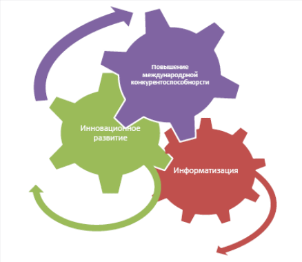 В результате «встречного движения» «колесиков» ИКТ-сектора, инновационного развития, повышения МКСП создается ситуация, при которой МКСП страны зависит от инновационного развития и построения ИО, а те, в свою очередь, - от повышения МКСП. Все три процесса «спаяны» в неразрывное единство общей нацеленностью на повышение благосостояния страны. Утеря любого из «звеньев» этого единства влечет за собой нарушение всей целостности.