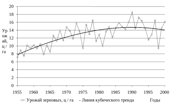 д.в. (Производство..., 1999; FAOSTAT..., 2001) В 1955 - 1990 годы наблюдалась тенденция увеличения среднего урожая зерновых культур, характеризуемая линией тренда (рисунок 1.1).