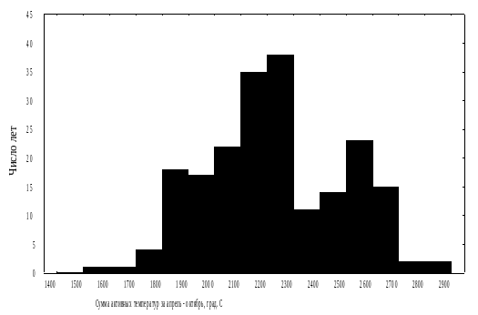 Установлено, что распределение сумм осадков и активных температур за данный период достоверно отличается от нормального закона при уровне значимости = 0,05 (по величине статистики Уилка-Шапиро).