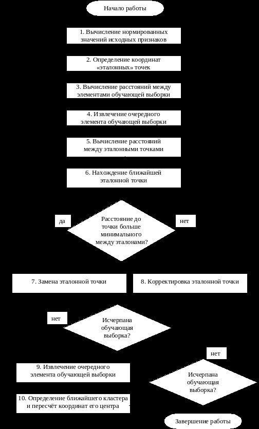 После того, как координаты эталонных точек установлены, производится распределение элементов обучающей выборки по принадлежности к классификационным группам (кластерам).