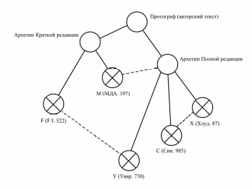 Таким образом, история движения текста Сборника представляется сле- дующей. На основе авторского текста Даниила в 1520-30-е гг. в митрополи- чьем скриптории были составлены архетипы двух редакций текста – Полная и Краткая. Архетип Краткой редакции отличался большей полнотой. С него в конце 1520-х гг. был списан древнейший список М, который Даниил не толь- ко правил, но и использовал в полемике. Вместе с тем, в ходе написания спи- сок М редактировался по архетипу Полной редакции, причем внесенные в него правки соответствовали правке самого архетипа. Список F был списан значительно позднее с архетипа Краткой редакции или родственного ему списка без сверки с тексом Полной редакции или списком М. Все последую- щие известные нам списки (Х, С, и У) были сделаны с архетипа или другой рукописи Полной редакции, причем две из них (Х и С) редактировались только по архетипу Полной редакции, копируя все его правки, а список У впоследствии сверялся с рукописью F или родственным ей текстом, исходя- щим из архетипа Краткой редакции. Предполагаемую схему движения текста