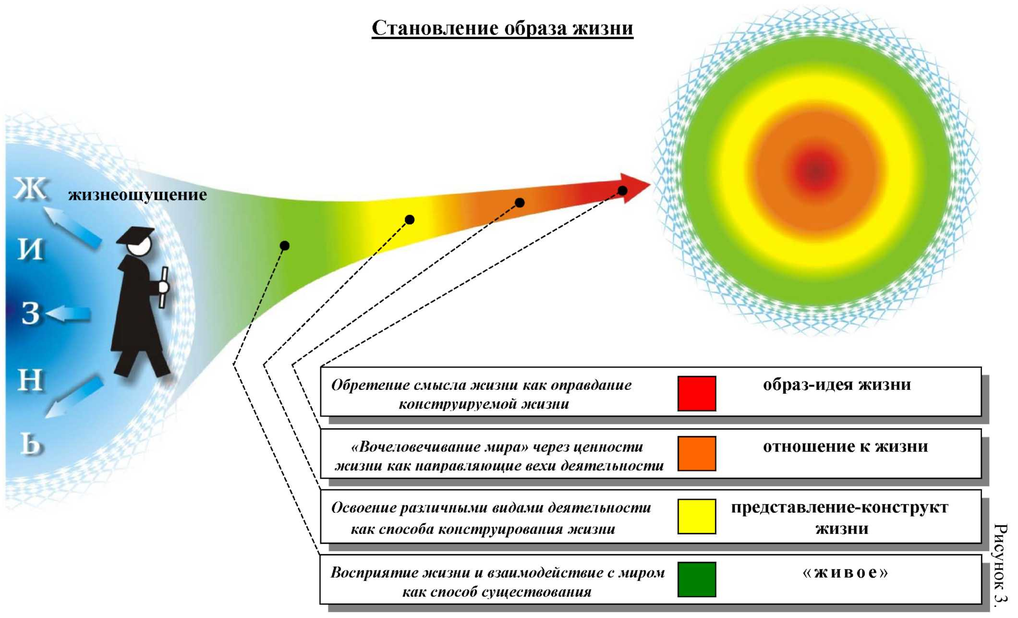 Содержательное наполнение образа жизни определяет философия, теория ценностей, педагог же раскрывает палитру типов образа жизни и предоставляет ребенку выбор. В этом выборе главную роль играет внутренняя установка ребенка, она распоряжается, отстраивает его восприятие и поведение, и он вне нашего, педагогического, влияния выстраивает свою деятельность по реализации собственного осознанного и самостоятельно выбранного образа желаемой им жизни.
