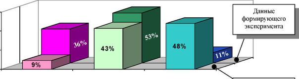 На рис. 12 приведены данные, подтверждающие эффективность разработанной нами экспериментальной системы обучения педагогов. При сопоставлении было отмечено увеличение числа педагогов, вышедших на высокий («индивидуально-творческий») уровень готовности (с 9% в констатирующем эксперименте до 36 % при завершении формирующего), повысилось число респондентов, обладающих средним («подражательно-репродуктивным») уровнем готовности (от 43 % до 53 % соответственно), снизилось число педагогов, чей уровень готовности оценивается как низкий («размытый»): с 48 % в начале констатирующего эксперимента до 11 % при завершении формирующего эксперимента.