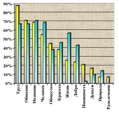 Анализ полученных результатов, приведенных в таблице, позволяет сделать вывод о том, что большинство педагогов на результативно оценочном этапе эксперимента на более высокий ранг поставили ценность человека, познания, жизни, в тоже время ценность материальных средств снизилась, как и уменьшилось восприятие жизни и работы как повинности, что может служить свидетельством повышения оптимистического отношения к жизни педагога.