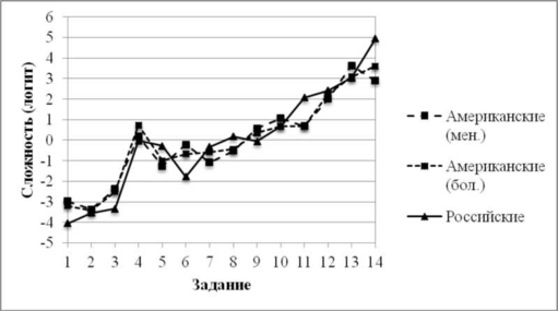 На Рисунке 4.2.1.1 отображена сложность (в логитах) каждого задания для трех групп. Как видно из этого рисунка, сложность заданий возрастает от начала к концу субтеста. Хотя оценки сложности заданий высоко коррелировали между выборками (г = .98 для двух американских подвыборок, .93 для российской и американского меньшинства, .96 для российской и американского большинства), наблюдалось расхождение между групповыми оценками сложности заданий. Формальный статистический DIF анализ взаимодействий между фактором группы (российские студенты и американские студенты - представители большинства или меньшиств) и заданиями при