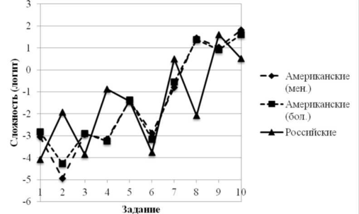1. (t(423) = 11.05, p < .05) и 10 (t(220) = 4.14, p < .05) оказались проще, чем ожидалось. Нами не было выявлено различий в функционировании заданий для двух американских подвыборок (все p > .05). Наличие DIF свидетельствует об избирательной сложности больше половины заданий для американских и российских студентов одного уровня способностей, что делает невозможным прямое сравнение показателей способностей в двух группах студентах при использовании процедуры соединения заданий на основе 10 общих заданий.