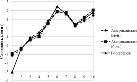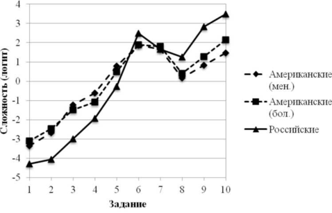 выборками (г = .98 для двух американских подвыборок, .93 для российской и американского меньшинства, .97 для российской и американского большинства), наблюдалось расхождение между групповыми оценками сложности заданий. Так, простые задания оказались проще для российской выборки, чем для американской, а сложные - сложнее. Формальный статистический DIF анализ взаимодействий между фактором группы (российские студенты и американские студенты - представители большинства или меньшиств) и заданиями при поправке на количество проводимых сравнений41 выявил шесть заданий, функционирующих (при поправке на общий уровень способности в группе) дифференцированно в трех группах.