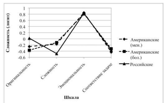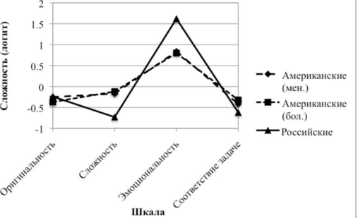 При анализе полученных показателей уровня развития креативности студентов, свободных от дифференцированного функционирования шкал и экспертов и пригодных для межгрупповых кросс-культурных сравнений, нами не было установлено значимых различий в средних показателях креативности