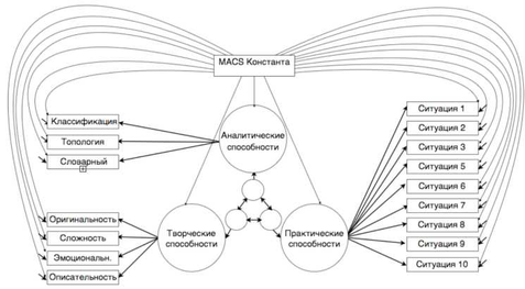 Рисунок 4.2.З.1. Структурная трехфакторная модель, проверяющая равенство средних по латентным переменным аналитических, творческих и практических способностей (М11) в группах российских и американских студентов. В целях обеспечения ясности представления результаты на рисунке не отображены два параметра, связывающих ошибки для ситуаций 7,9,10 для американской выборки.
