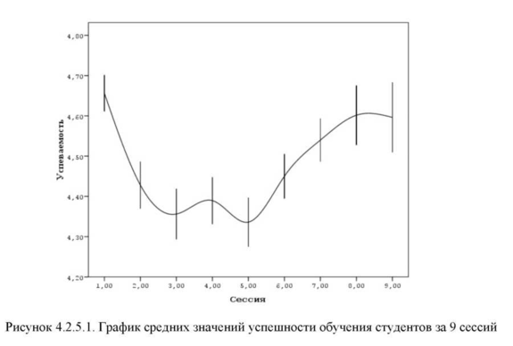 .13,р > .05), т.е. студенты в среднем первую сессию сдали на 4.63 балла и в течение первых трех сессий теряли в успеваемости .13 баллов за сессию, с 3 по
