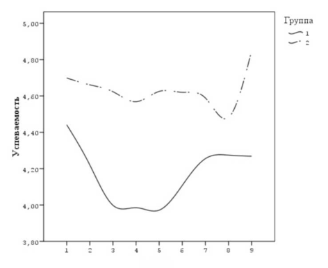 На Рисунке 4.2.5.2 представлены предсказываемые моделью траектории изменения успешности обучения (fitted values) для двух групп студентов на