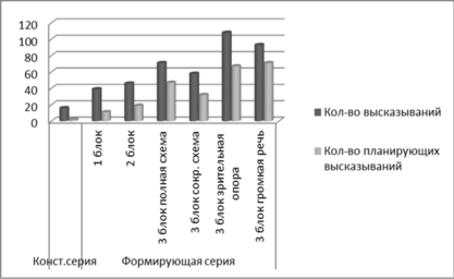 Рис. 1. Общее количество высказываний и количество планирующих высказываний на разных этапах формирующей серии (абс.зн.).
